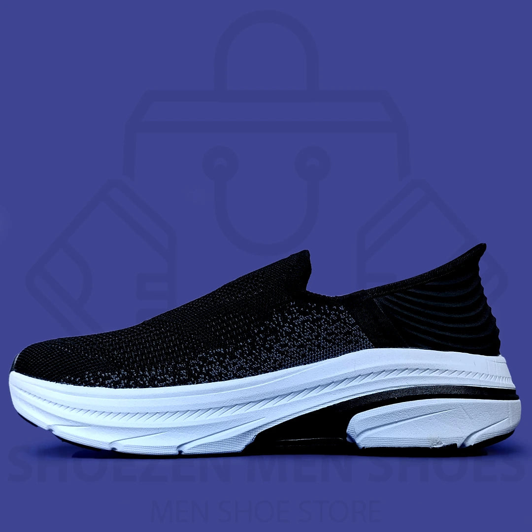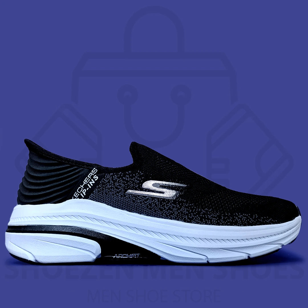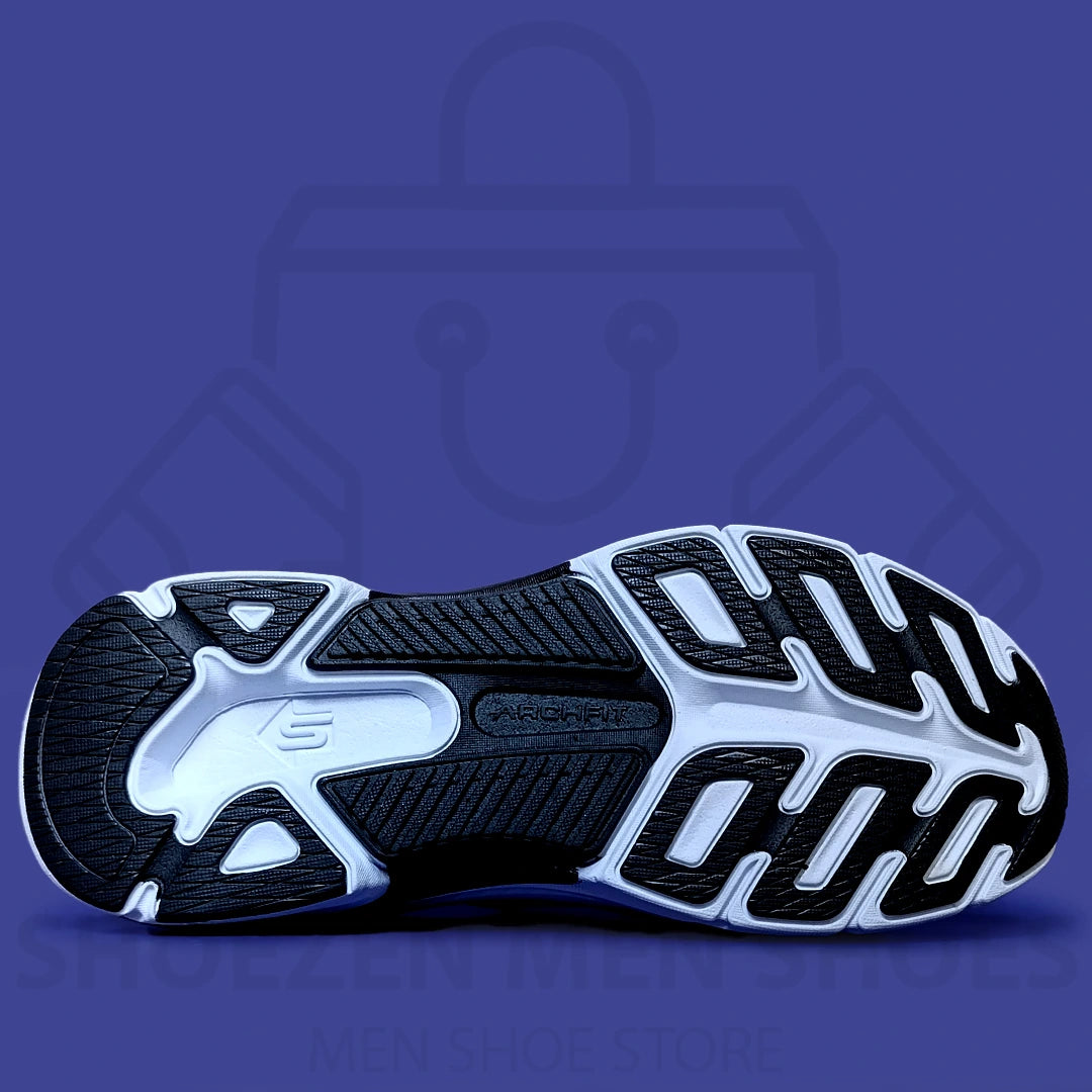 TRENDY ARCHFIT SKECHERS - SHOEZEN MEN SHOES - Black and white running shoe with visible brand logo on a blue background