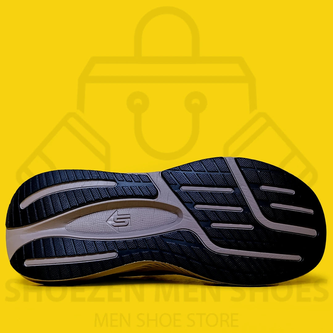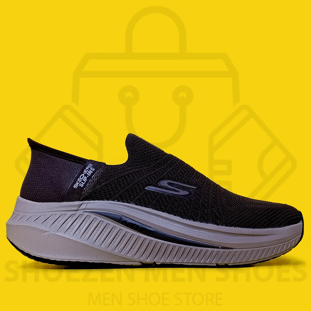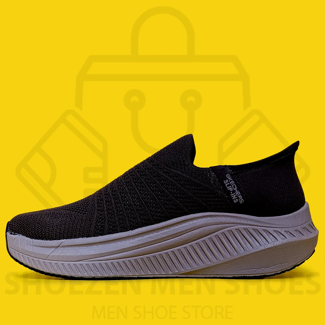 TRENDY SLIP-INS SKECHERS - SHOEZEN MEN SHOES - Black slip-on shoe with white sole on a yellow background